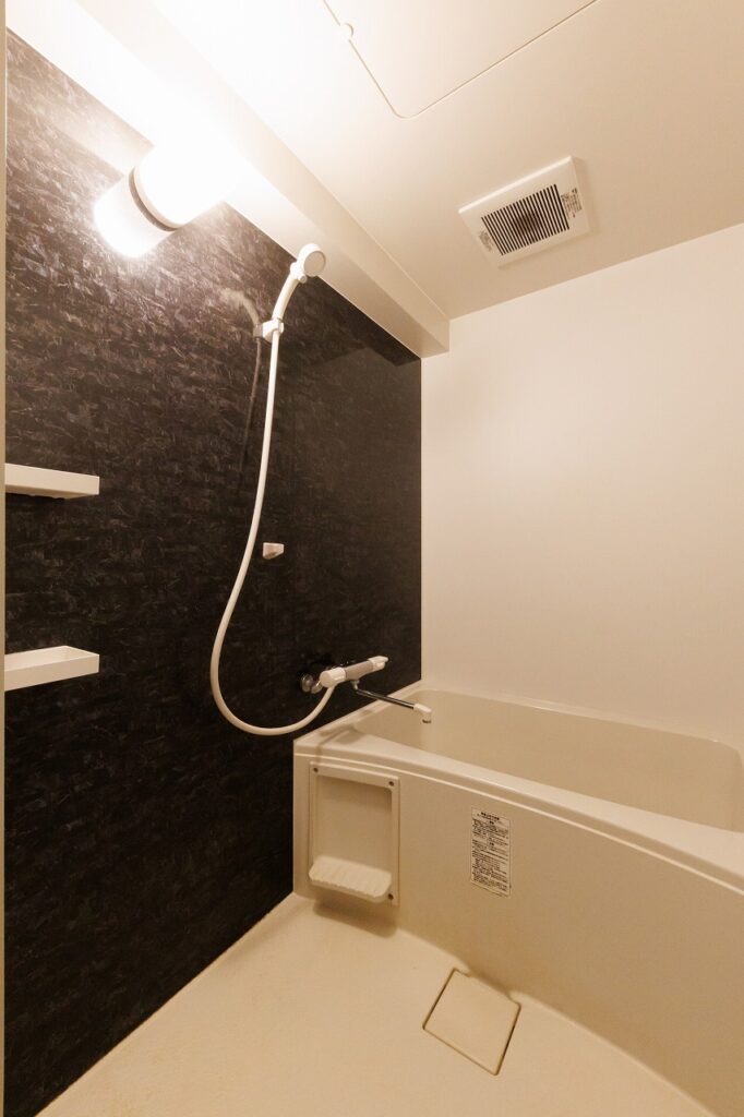落ち着いたアクセントパネルが印象的な、清潔感のあるバスルーム