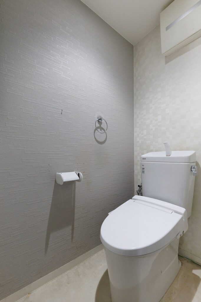 アクセントクロスが印象的な、清潔感のあるトイレ空間